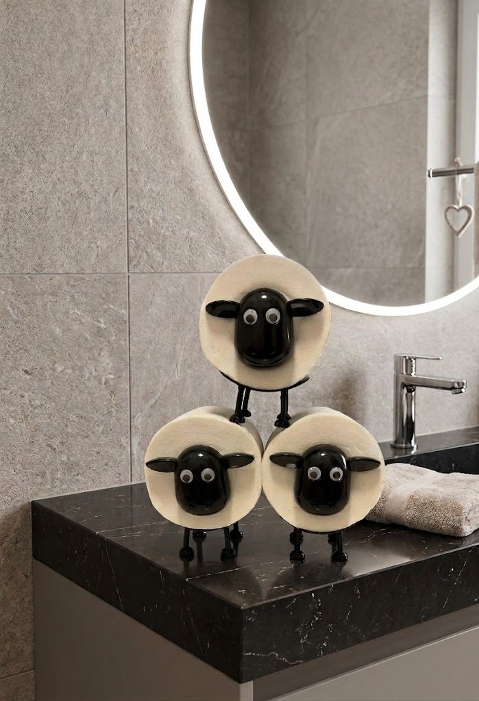 Het ontwerp met pootjes en een zwart schaapgezicht geeft de houder een speelse uitstraling die direct opvalt bij gasten. De wc-rolhouder is vrijstaand en kan eenvoudig op een plank, kastje of naast het toilet worden geplaatst.